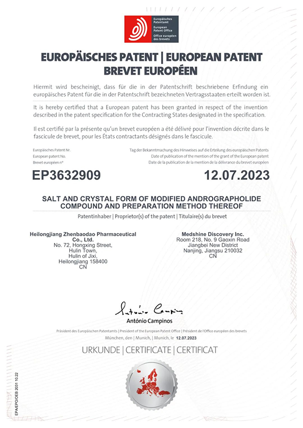 8月15日,珍寶島藥業(yè)發(fā)布公告。公司收到歐洲專利局頒發(fā)的內(nèi)容為《一種穿心蓮內(nèi)酯改構(gòu)化合物的鹽型、晶型及其制備方法》的專利授權(quán)證書(shū)。其國(guó)際專利申請(qǐng)?zhí)枮镻CT/CN2018/088168,專利權(quán)期限為申請(qǐng)之日起20年。